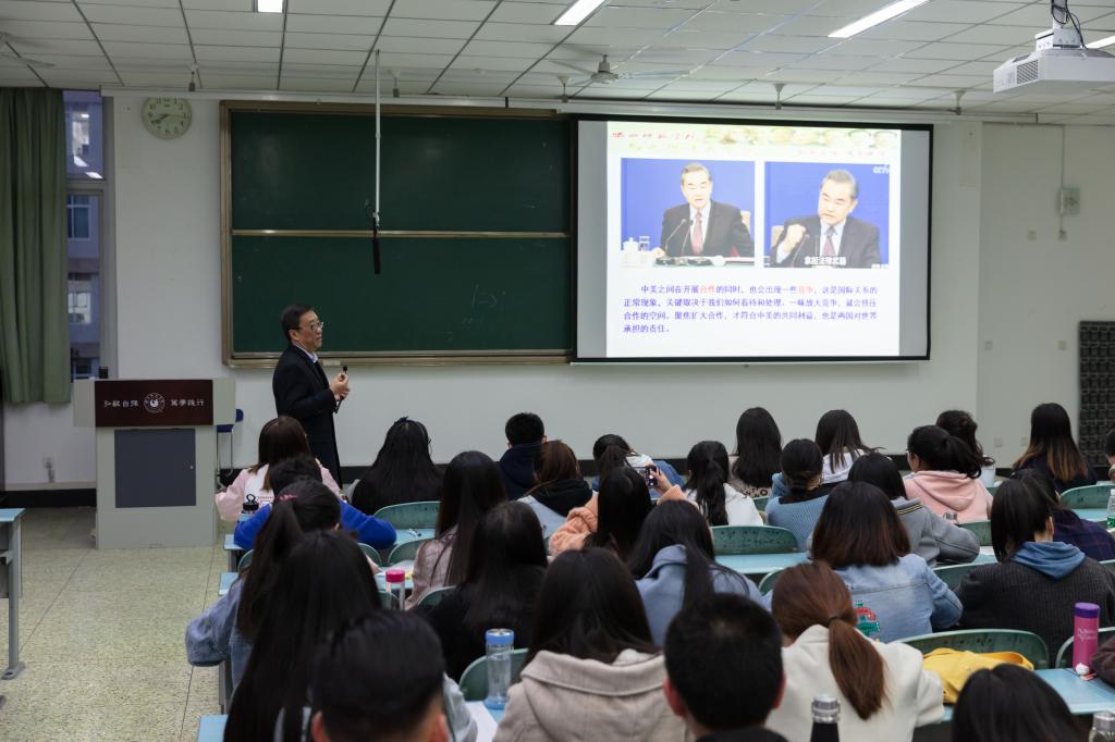 胡书记的讲授围绕三个“基本”即“了解‘两会’精神的基本视角”“2019年政府工作报告的基本精神”“贯彻好‘两会’精神的基本要求”展开。“今年是中华人民共和国成立70周年,那么重庆、成都、乐山分别是什么时候解放的呢?”“2018年中国国内生产总值增长6.6%,总量突破90万亿元,经济增量相当于澳大利亚2017年的经济总量。四川在全国的GDP排名如何?乐山在四川的排名又是第几?如何看待四川‘一干多支、五区协同’的区域发展格局?影响我们新校区建设顺利推进的主要因素是哪些?”“为什么同样遭受美国的打压,中兴和华为的表现迥然不同?”“必须增强自主创新能力,必须掌握关键核心技术!”“怎么理解今年国内生产总值的预期增速目标为6%-6.5%?”“怎样理解财政政策、货币政策和就业优先政策这三大宏观调控政策的关系?”一个接一个的问题,逐渐激发了同学们的理性思考。胡书记在授课结束前谆谆教诲同学们:要把学习贯彻全国“两会”精神与调整个人职业生涯规划结合起来,密切关注与自身专业和职业规划相关的政策;要把学习贯彻“两会”精神的政治热情不断转化为勤奋学习、全面发展的强大动力,努力争做担当民族复兴大任的时代新人。
