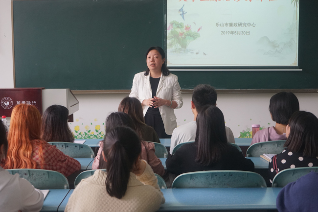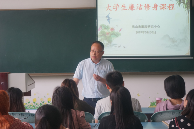 本网讯(文/薛兰、图/骆家乐)5月30日下午,由乐山市廉政研究中心开设的《大学生廉洁修身课程》于行知楼123教室正式开讲。校党委副书记、纪委书记陈范华、党委宣传部副部长蒋政、政法学院副院长程勇、教师张继兰、杨文霞及我校部分学生干部参加。