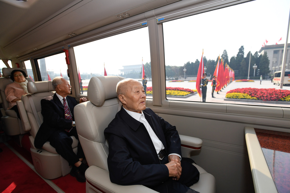 9月29日,“共和国勋章”获得者张富清、黄旭华、屠呦呦乘车抵达人民大会堂东门外广场。