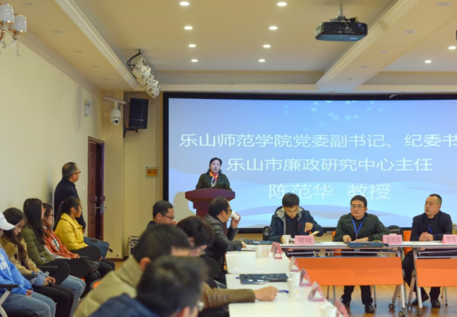 12月7日,由乐山市廉政研究中心举办的“新时代党风廉政建设和反腐败斗争的理论与实践”学术研讨会于实训楼A510召开。校党委副书记、纪委书记、廉政研究中心主任陈范华,科研部部长、廉政研究中心学术委员会主任陈天柱,政法学院副院长程勇、苏祥,四川大学、重庆工商大学的专家学者,市政府相关部门实务工作者以及廉政研究中心课题负责人及部分学生50余人参加本次研讨会。开幕式由程勇主持。