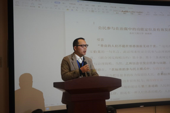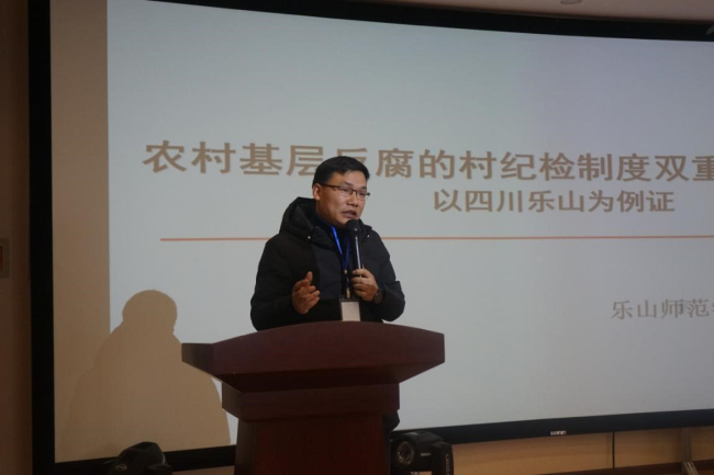苏祥主持主旨发言。峨眉山市人民法院刑庭庭长郑欣以基层法院审理的反腐案例为切入点,作了题为“反腐败问题与从严治党”的发言,通过“职务犯罪”典型案例引发与会人员思考基层党员责任心问题。四川大学公共管理学院副教授雷尚清,以“构建不敢腐、不能腐、不想腐的长效机制初探”为发言主题,从理念更新、重申利益冲突、做实外部参与、大力采用新技术、制度精细化等五个方面提出推进不敢腐、不能腐、不想腐长效机制的构建。乐山市人民检察院检委会委员、公诉处处长李芳玉,结合工作经验,作了“认罪认罚从宽制度适用与职务犯罪办理若干问题思考”的报告,分析了认罪认罚从宽制度的社会意义及实施方法。重庆工商大学法学院副教授袁维勤围绕“公众参与在治理腐败中的功能问题”,阐释了提升公众反腐败意愿、观念的重要性;政法学院张茂一老师从乐山村纪检制度的实际情况,从制度设计与运行、制度困境、制度完善三个方面详细介绍了农村基层反腐的村纪检制度。参与人员还就发言主题进行了交流研讨。